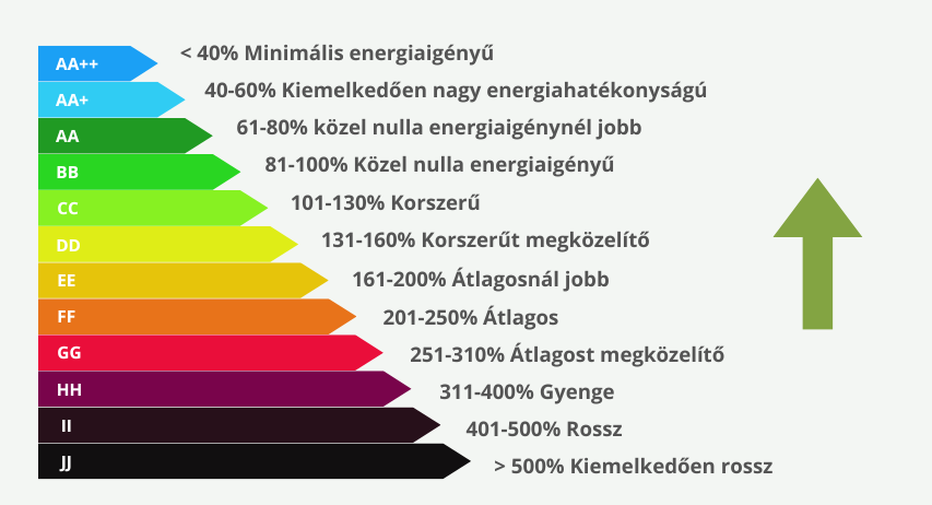 A hazai lakásállományok jelentős része az energetikai viszonyokat tekintve átlagos (FF) energiateljesítményű, azaz legalább kétszer annyi energiát fogyasztanak, mint egy energetikailag korszerű (CC) épület. Utólagos felújítással egy 30-40 éve épült ingatlan esetében is elérhető a korszerű állapot, amellyel jelentősen növelheti ingatlana értékét is. Az új építésű házak esetében már elvárás a legalább közel nulla energiaigény, azaz BB energetikai besorolás, Ön is majdnem eddig eljuthat.